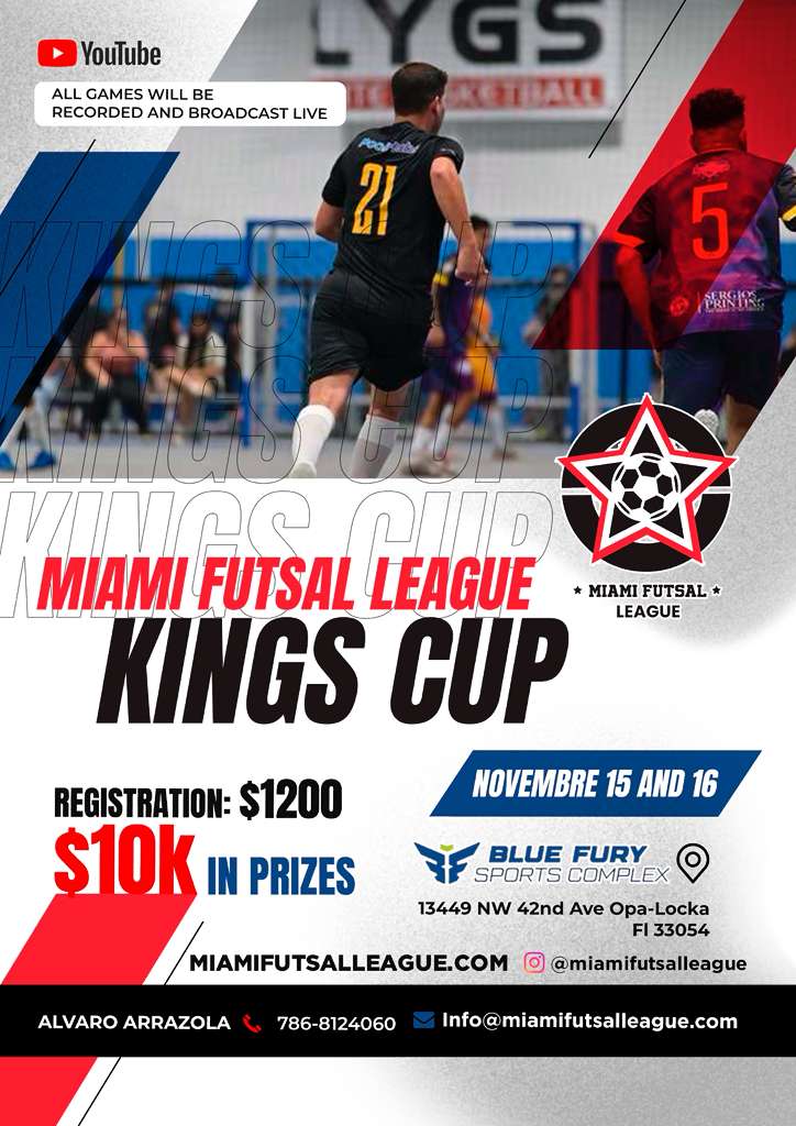 Participa en la KINGS CUP, el torneo oficial de la Miami Futsal League que reúne a los mejores equipos y jugadores profesionales de futsal en Miami.